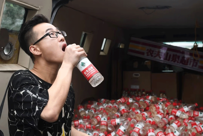 Despite the disapproval of the local government, Nut Brother filled 10,000 bottles with contaminated water from the village and displayed them in the city. To show the stark difference in water quality, he used the bottles of a popular Chinese spring water brand.