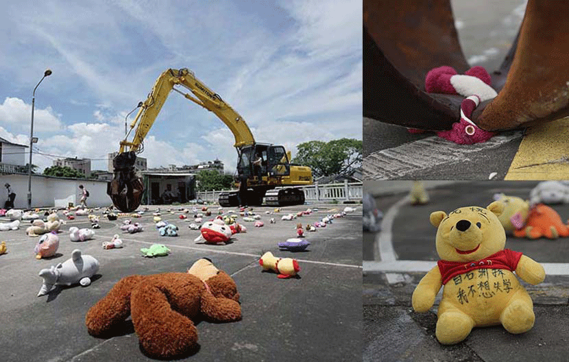 Nut Brother placed some of the children’s toys around the open area where an excavator would pick them up and throw them into the curb. This project clearly illustrated what the redevelopment plan would mean for the people.