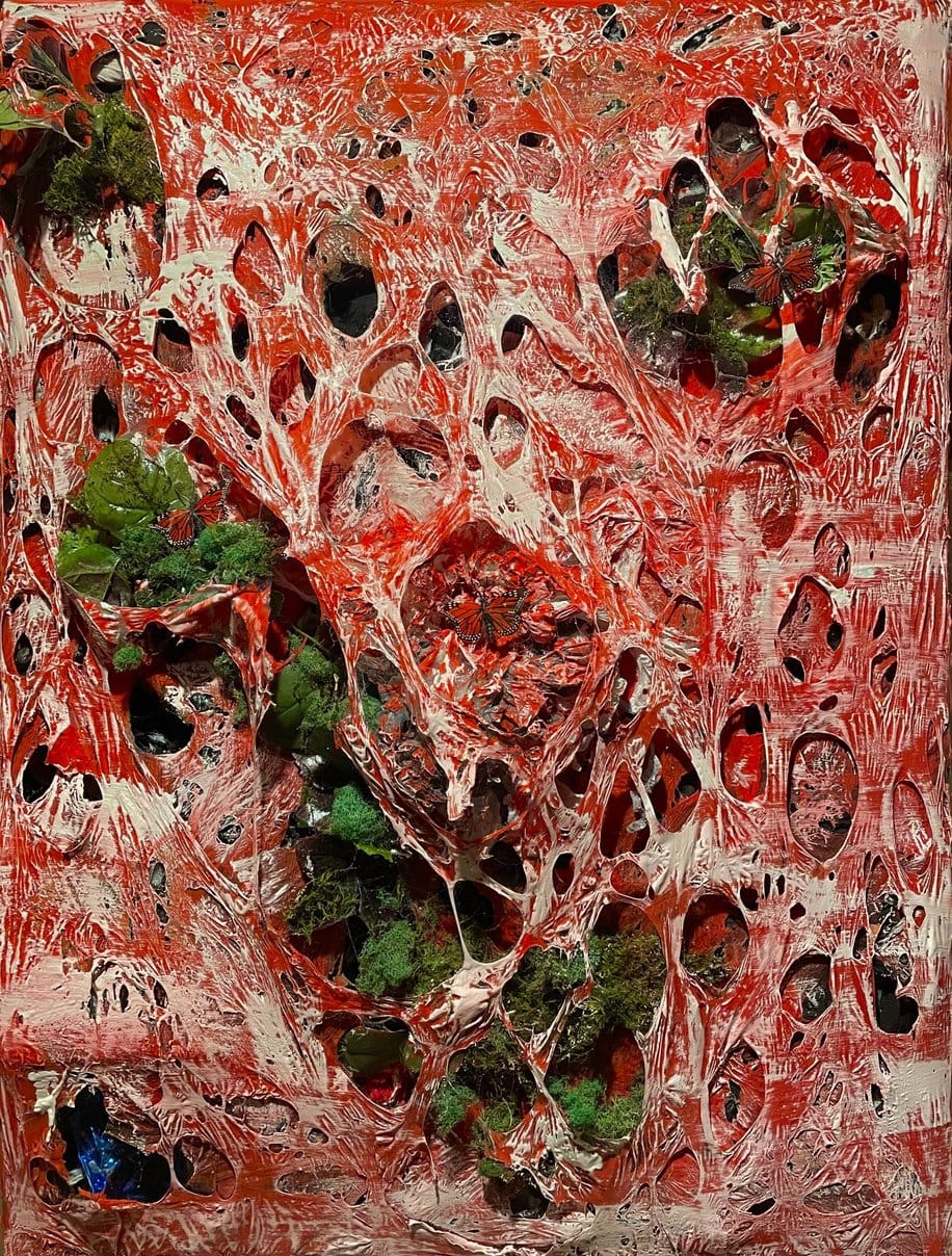 Gray d’Éon creates abstract paintings by attaching and forming recyclable cellophane onto canvas. She then takes a blowtorch to the layered plastic and creates a porous structure resembling an ant’s nest. Within all the plastic layers, d’Éon attaches little paraphernalia such as plastic leaves, ornament butterflies, magazine clippings and various other packaging trash.