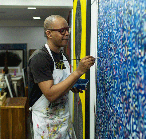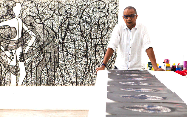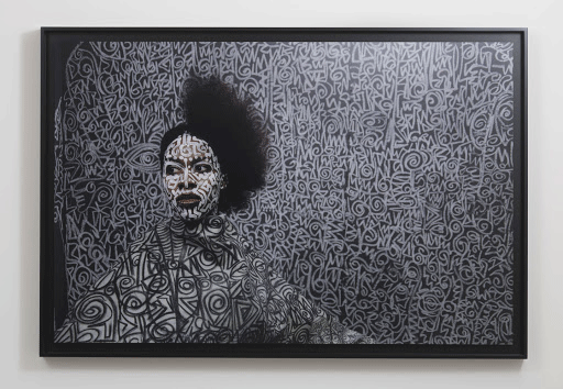 One of Africa's most prominent artists is Victor Ehikhamenor. A Nigerian multi-faceted artist who has all-around skills in drawing, painting, photography, sculpture, and installation.His work represents his upbringing in Edo State culture where he takes traditional patterns and iconography from local shrines to produce his own unique style. His style is recognized as gestural abstraction with script-like forms revealing faces and objects.