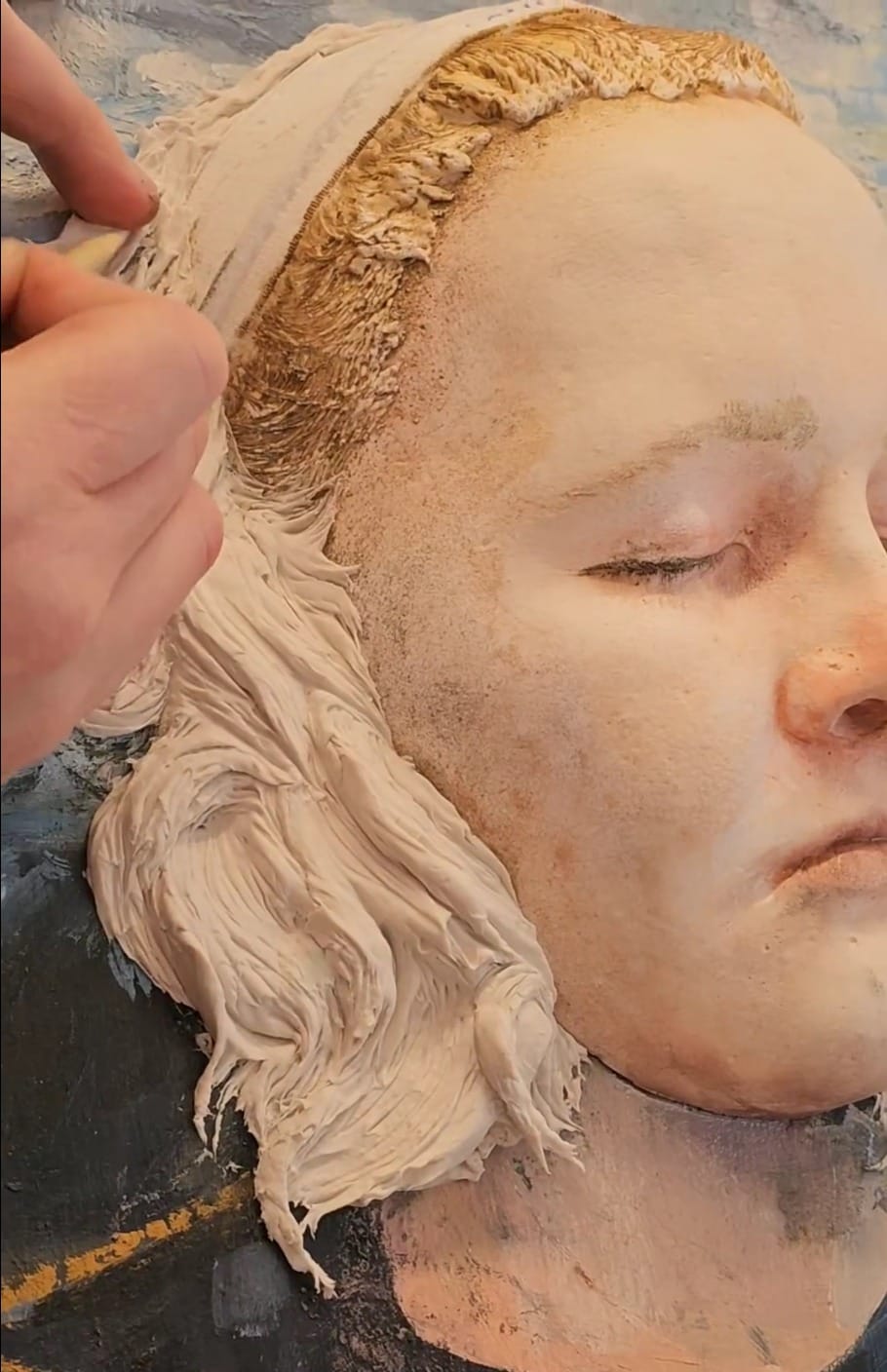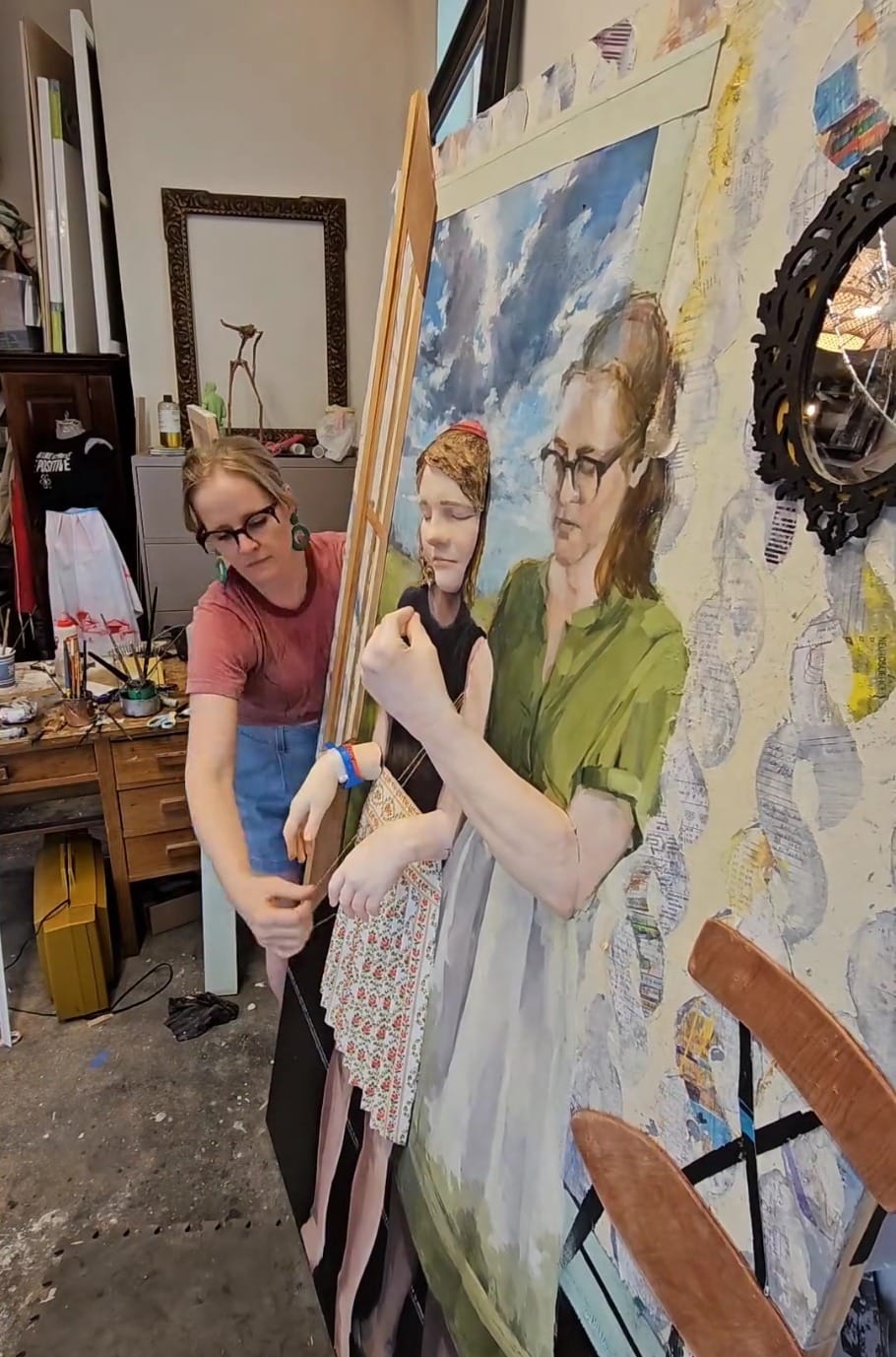 Scoggins began working on The Caretaker And The Warrior to help raise awareness for those living with EDS. Per the title, the painting portrays her taking care of her warrior teenage daughter who has been fighting her EDS diagnosis. Scoggins wants people to understand that despite her presence there as the caretaker, the piece really is about the warrior: her daughter. To drive the viewer’s eyes to her daughter, Scoggins decided to cast her daughter’s face as a sculpture on the piece, making it stand out on the otherwise flat surface of the painting. Casting her daughter’s face also allowed Scoggins to capture her daughter’s finer details, rendering her pores, hair, and scars as they are in real life. By doing so, Scoggins had managed to faithfully capture her daughter and her perseverance, making it truly a personal piece.