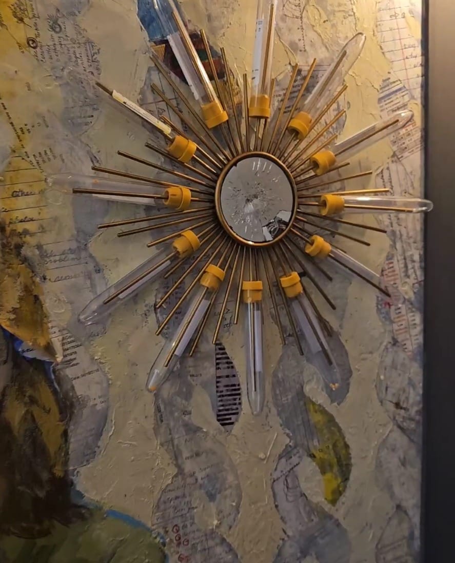 The final detail that brings the piece together is a sundial made out of a broken mirror, needles, and blood sample vials. Scoggins explains in a video that this detail alludes to the medical trauma that comes from dealing with a chronic disease without a cure. It becomes an artifact of all the days wasted treating symptoms, constant needle jabs, and blood samples taken seemingly to no end. At the end of the day, this is why Scoggins made The Caretaker and the Warrior, to campaign for a medically informed future for those living with EDS so that they are able to live their lives to the fullest, free from daily chronic pain.