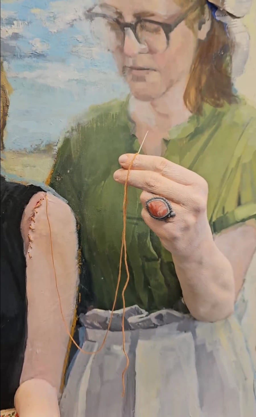 Another profound detail from the piece is Scoggins’ hand holding a needle and thread, seemingly sewing her daughter’s hand into place. The painting’s composition makes this the second detail that draws audiences’ eyes in, revealing that this is its second most important message. For Scoggins, this detail is a nod to her caring for her daughter through EDS. The illness especially affects a person’s joints; hence, taking care of her may visually feel like sewing someone’s joints into place.