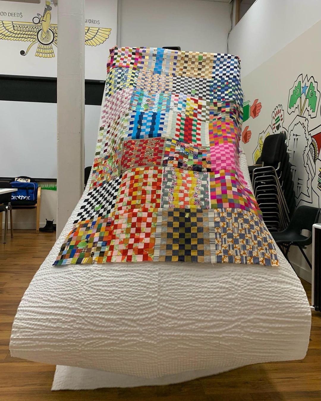 To make the ongoing quilt, Shadeck-Triola created an open call on the project’s Instagram page where anyone interested in contributing can send her a batch of 100 square inches of quilted cubes. These sheets of quilts often come with handwritten notes, heartfelt thoughts and reflections from the participating artists who are all universally calling for a ceasefire in Palestine.