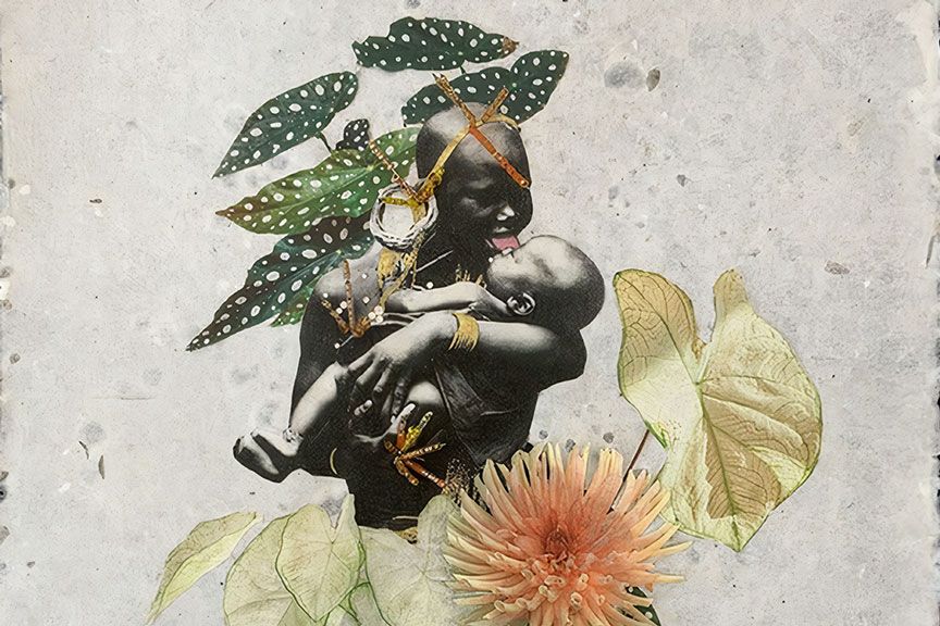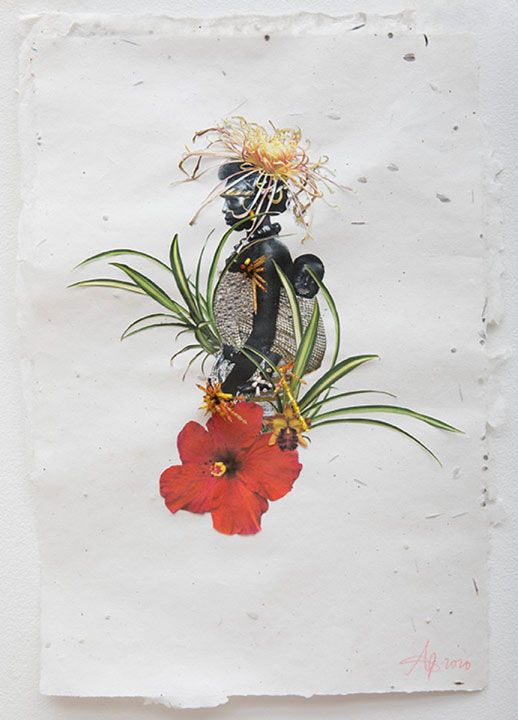 In the centre of the paper is a Black woman and a Black baby wrapped onto her back. The clothing on the mother and the baby’s wrap are both beaded with small silver jewels. Ink is painted onto finely cut paper that has been sculpted to resemble living plants. A faux spider plant extends from the centre mother and child. It goes in opposite directions—one on the mothers beaded postpartum stomach, and the other receding from below her and the baby. Additional yellow and red beads go vertically outwards from a drawn red flower and the depicted mothers arm. Atop her head is the last botanical on the print, which sits upon her almost as if it is a crown.