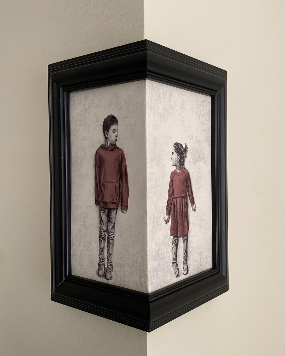 British artist Andrew Scott creates surreal art pieces where he uses his artwork’s frames to break the fourth wall with the world that his characters inhabit. More often than not, his characters are children who are reaching out to a character that lives in another frame. The children Scott has painted come from diverse backgrounds. His pieces allude to the subjects of his work coming from other countries, faiths and more.