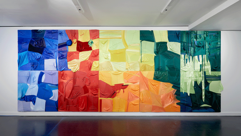 For example, durags are a ready-made material Akinbola uses in his art. The artist discusses the cultural influence relating to durags, a fabric hair covering used to maintain or protect Black hair. Akinbola mentions the history of durags by expressing how they once used to make Black people appear non-threatening but we now see the reverse occurring in society. After using hundreds of durags for what he thought would be a one-off piece at the Queens Museum in 2018, he developed his own style of art that uses the infinite colors and textures of durags to mimic the strokes of a paintbrush.