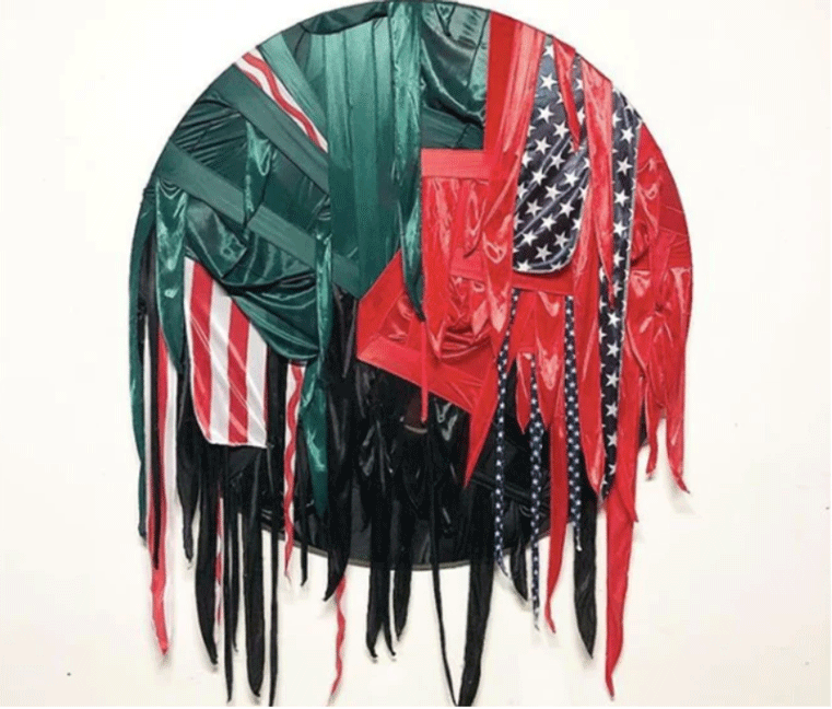 Target Practice was a collage piece from 2015 where the artist stitched portraits of his Black friends on top of an American flag, with shooting target lines on each of their bodies. Akinbola had interviewed each person and included audio where they spoke of their experience being Black in America. This piece was completed by Akinbola a few years after he was a victim of gun violence himself. The inspiration for this collage was the exploration of Akinbola’s own perspective on gun violence and a deeper understanding and acceptance of his Black American identity.