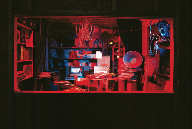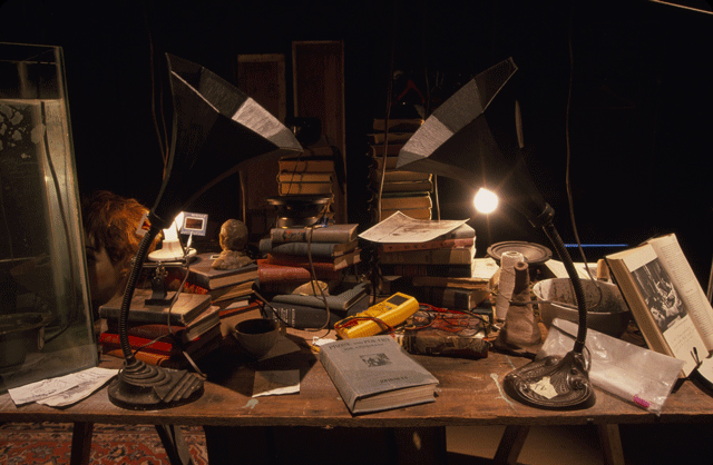 The Dark Pool is an immersive, sculptural installation space––a viewer (or participant) of the piece enters through a simple white door. Behind the door, is a dimly lit warm space that feels reminiscent of a basement antique shop. The space is ornamented with various antique tables covered with dusty books and other timely objects like typewriters, mannequin heads, picture prints, and multiple gramophones. As a viewer explores the intricate, ambiguous space, they are met with various staticky voices speaking from overt and hidden sound machines; one is constantly inspired by new objects to discover and new sounds to perceive. According to Front Magazine, “This piece pursues the artists’ interest in narrative structure and how narrative is enacted and affected by video, audio and objects. Both Cardiff and Miller have worked with interactive technologies, exploiting the confluence of distance and closeness that these interactions can create.”