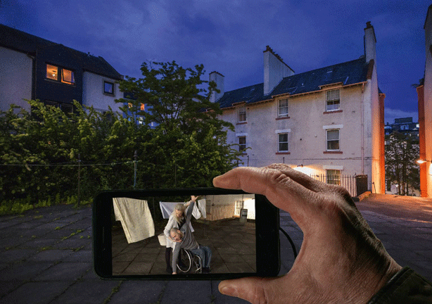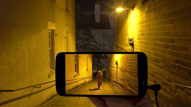 Night Walk for Edinburgh is the artists’ most recent performative nature walk that was created for the Edinburgh International Festival in 2019. It is now a permanent part of The Fruitmarket Gallery’s Collection. The night walk “is a 50-minute walk through the Old Town of Edinburgh after dark.” To engage in one of Cardiff’s and Bures Miller’s art walks, including Night Walk for Edinburgh, viewers are given a smartphone, or electronic viewing device, with a pair of headphones. From there, they are taken on a path as Cardiff’s voice guides them through the tour. Simultaneous to hearing Cardiff’s voice, viewers hold the electronic device directly in front of their heads at eye level––what they see is a previous recording of the same space that their body is in, in real-time. Through the recordings, viewers encounter people, characters, and happenings that are not present in the real-life space. In conjunction to the visuals of the recording and real-world space, Cardiff’s voice verbalizes instructions, stories, and poetic phrases. In Night Walk for Edinburgh as a viewer is “led through the backstreets of Edinburgh’s Old Town,” they experience the telling of an “unravelling a disjointed tale – part game-playing, part surrealistic poetry, perhaps even a murder mystery – layered with history, invention and memories.”