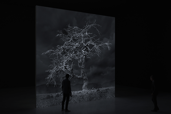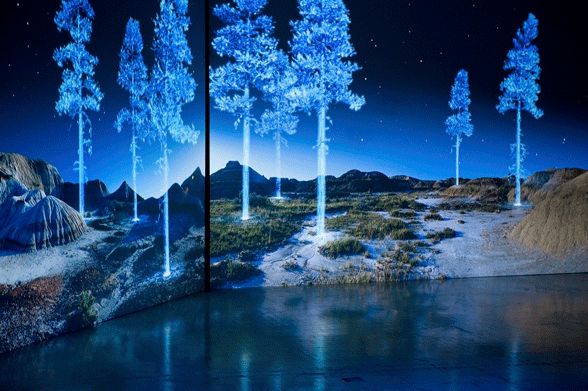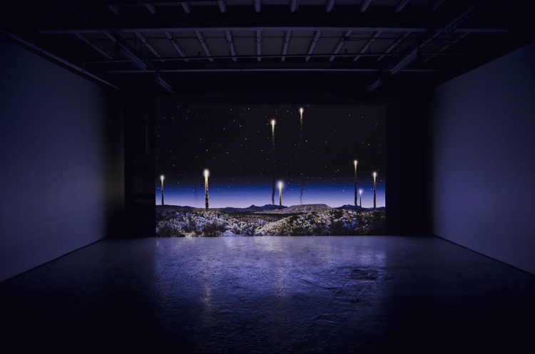In a 2011 exhibition review for Canadian Art, Shannon Anderson expresses that, “Time after time, Kelly Richardson’s videos feature intensely beautiful landscapes interrupted by a disquieting presence that shifts everything toward the hyperreal.” Richardson’s works teeter between representations of fiction and reality. She regularly combines the aesthetics of documentary cinema and science fiction films and believes that as a creative genre, science fiction allows humans to imagine what the future of life on earth might be like. Her 2010 three-channel video installation, The Erudition, for example, depicts real scenic views “set in the Alberta Badlands,” alongside “a gathering of holographic trees.” Richardson describes The Erudition as “a lunar-esque looking landscape with what appears to be an unlikely monument or proposal, consisting of holographic trees blowing in fictional wind. Is this slightly malfunctioning display a forgotten site for proposed colonization? Better yet, is this some kind of alien artwork?”