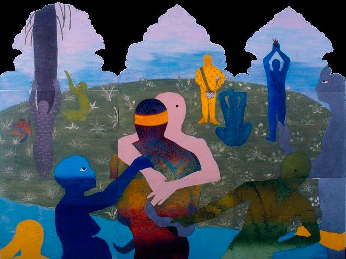 Featureless, androgenous figures wander through the open spaces of her work. These formless figures move in between time and space; their lack of clothing, skin or defining facial features bind them to no known history or people. Their only defining characteristics are their bright, almond-shaped eyes, bearing witness to the audience with an uncanny intimacy.