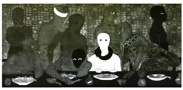 Women remain on the outside of the secret brotherhood of Abakuá. But, they are there, on the inside as the secret. The legend of the Abakuá begins with a woman, Princess Sikán. While drawing water from the river, Sikán heard the voice of the Abakuá bellow from a fish. The fish, the incarnate of an old clairvoyant king, becomes a symbol of wealth and power. Yet even in myth, women were barred from this secret knowledge. Sworn to secrecy by a local diviner, Sikán was sentenced to death when she shared her knowledge with her beloved. Nevertheless, Sikán continues to live in Ayón’s art.