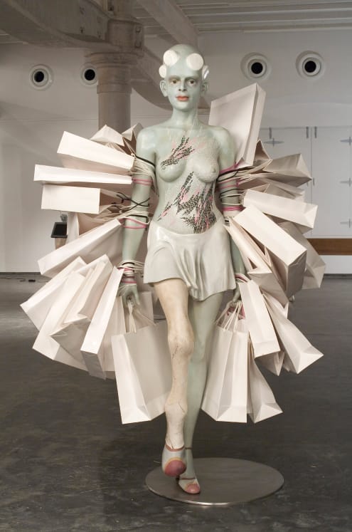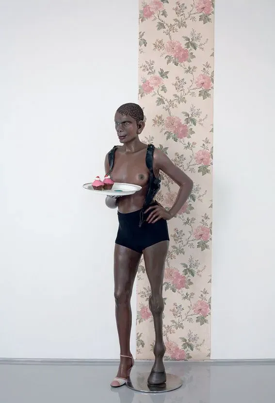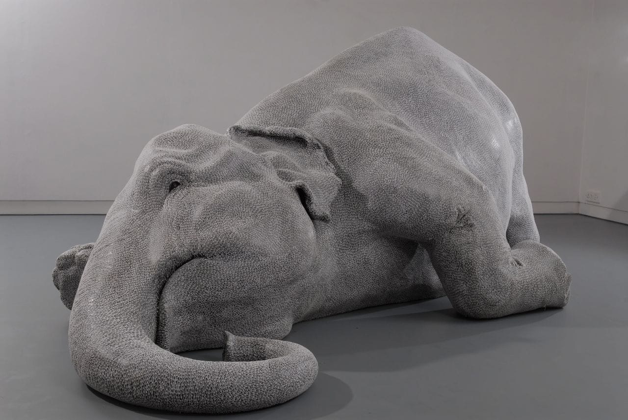 First used in 1995, her usage of bindi, a precious accessory that many South Asian women can be seen wearing, is an integral part of most of her works. One of her works, The Skin Speaks a Language Not Its Own, features a life-sized female elephant kneeling on the floor adorned with bindis shaped like tiny sperms. Sperm-shaped bindis slithering across the sculpture’s the idea of futuristic femininity is also explored in her other artworks like her 2004 work Arione and 2006 Arione’s Sister which combine elements of animal and human form.