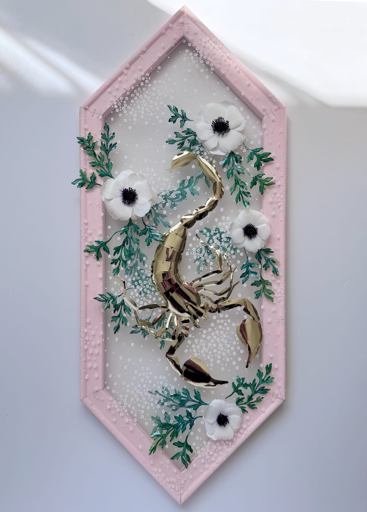 In Rogelstad’s hands, everything from a scorpion’s exoskeleton to a rat’s skull can be made with hand-cut sequins. These pieces were sculpted with utmost care that even remote details such as the slightest dents in skulls and serrations in bones are visible. As sequins are typically metal or plastic, materials associated with strictly human-made things, juxtaposing them with memento moris allows Rogelstad to reflect on the complicated legacy of human technology and innovation.