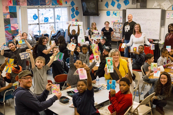 I volunteered at Weatherby in my friend Lisa’s classroom for seven years. I would go on my lunch hour and bring in art supplies, teach the students different techniques, art history, and about artists. I also brought in automotive designers–anyone I could get to come to the classroom and talk to the students. I would come to the school and the kids would literally race in, even in the winter, ripping off their coats and ready for art. The timing was right. I thought I could be doing more and that was where the foundation for starting Art Road came from. I wanted children to have the same sense of joy and accomplishment that I have had through art.