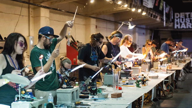 In the past, the three-day glass festivals have been held in July at the Russell Industrial Center in Detroit [the headquarters of the Michigan Glass Project] with glass artists from Michigan and across the United Sates making art live. All the glass works made during the festival are auctioned off for charity with the proceeds going to Art Road. This year, with the pandemic, the festival is going to be a virtual event in the fall.