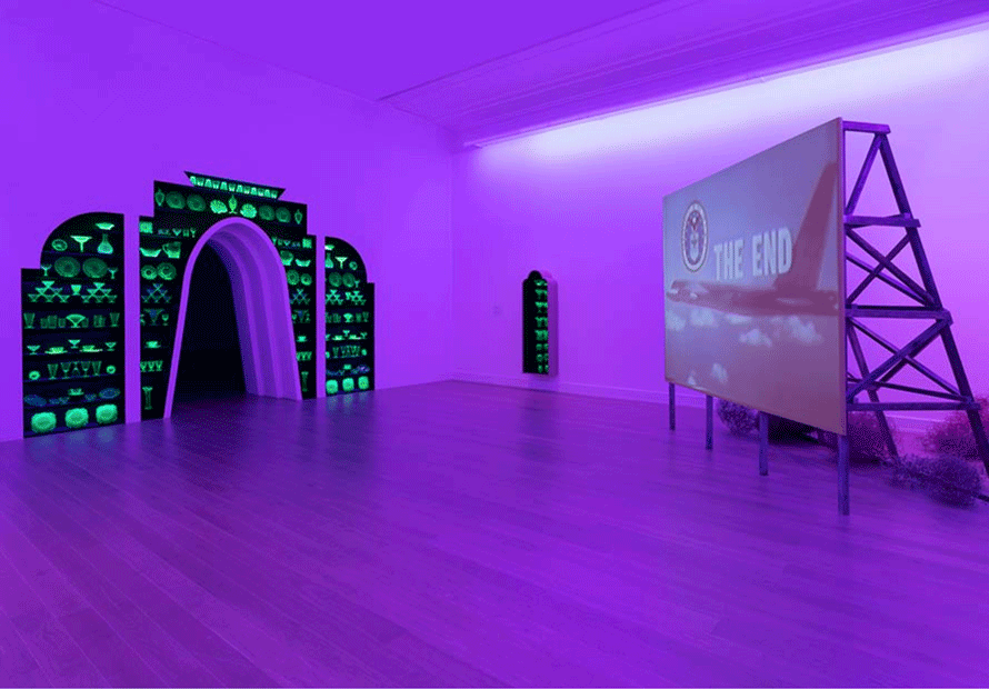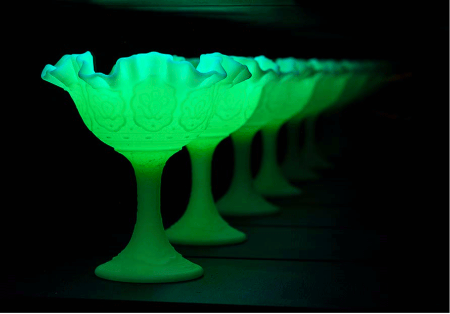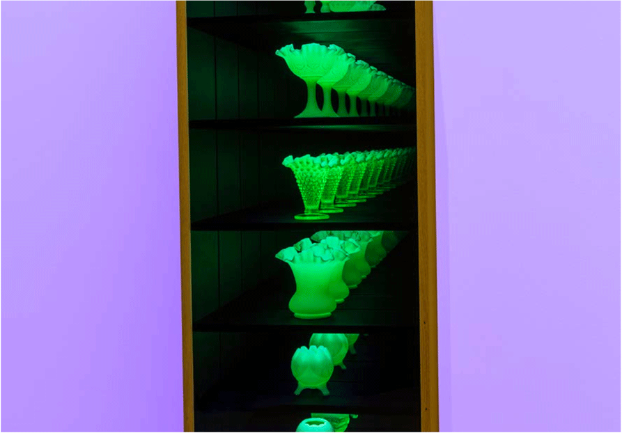 One of the centerpieces of the Specter exhibit is Under the Rainbow, a set of curio-cabinets filled with mass produced glass dishware from the Depression Era, all of which shine bright green under UV lights, a result of the presence of uranium oxide within the colourant of the dishes. This is where Despain’s history shines through her art. In being one of the many generations within her family to have grown up in the fallout region of the U.S. government’s nuclear testing, Despain utilizes these “nuclear dishes'' to highlight that the U.S government has hidden exactly how and where nuclear technology has been utilized since its creation, and how “regular families, who were just living their lives” had to face nuclear-related atrocities at the hands of their own government .