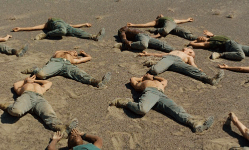 Claire Denis’ Beau Travail (1999) begins with the close-up image of a mural, where silhouettes of soldiers are pressed against a red sky. The cracks and bumps form ridges across the mural, letting the shadow and light play with one another, as Adjudant-Chef Galoup, the leader of his section of the French Foreign Legion, narrates the events leading up to the end of his career.