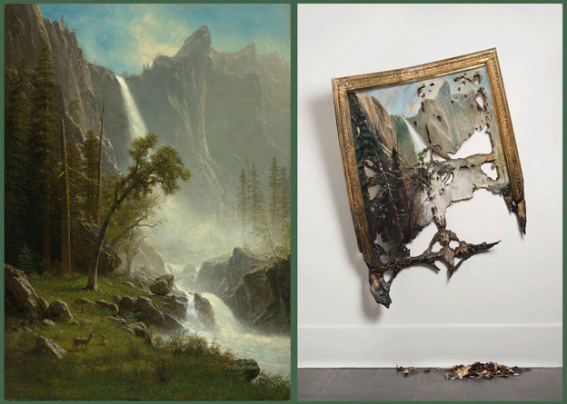 Take, for instance, "Nature's Nation: American Art and Environment," a collection of paintings, sculptures, prints, drawings, photographs, videos, and decorative art that premiered at Princeton University in 2018. The works range from a variety of periods and explore the depictions of environmental change over time. One standout moment from the exhibition is Albert Bierdstadt's majestic North American landscape juxtaposed next to Valerie Hegarty's Fallen Bierstadt, the same image but with the canvas and its landscape burned and ravaged. The result is a clear understanding of ecological change: what was once revered as the vast wilderness is under attack.
