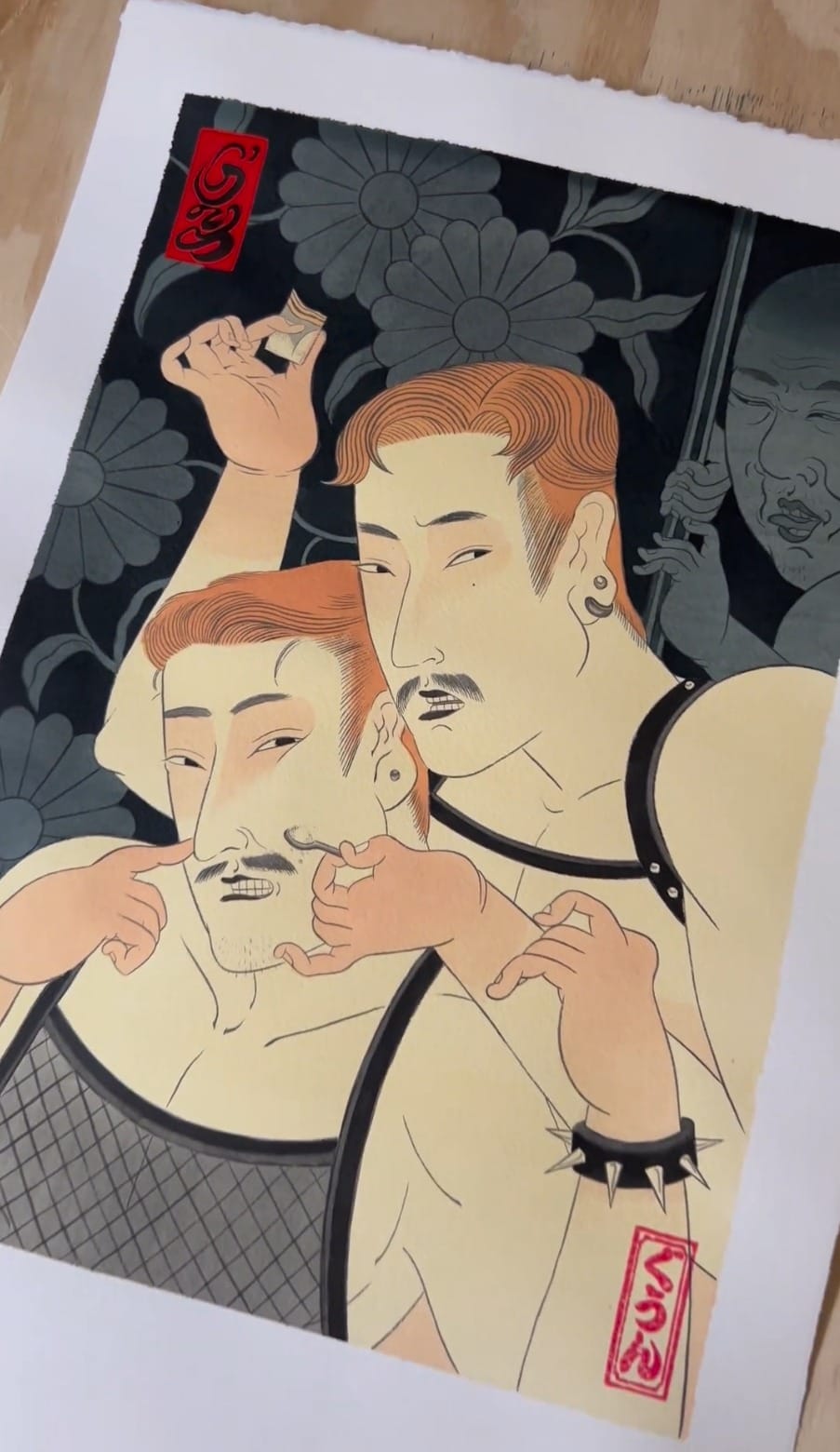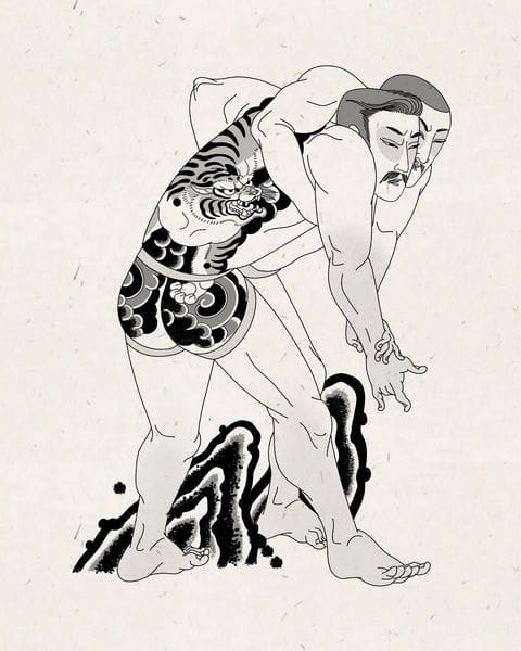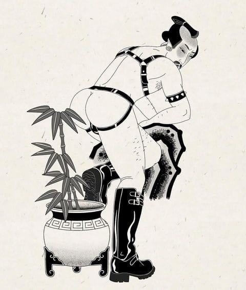 Le Goon creates tattoo designs and watercolour and acrylic paintings on paper depicting gay men and their lovers. He is using shunga as a primary style; these were traditional erotic Japanese ink or woodcut paintings commonly found in hand scrolls and illustrated texts. True to Le Goon’s subject matter, shungas were known to be a medium in which female sexuality and homosexuality could be explored without restraint. In shungas, it was common to depict figures with exaggerated sexual organs or facial features to emphasize sexual pleasure, a feature that is also featured in Le Goon’s pieces.