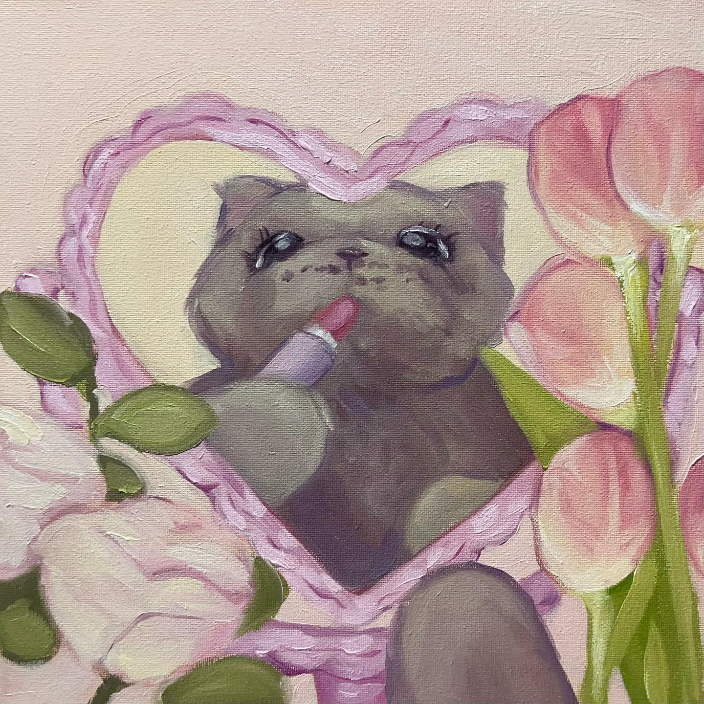 In the case of Felix’s art, however, more in-depth reading is certainly possible. Pink ribbons and dresses are often present in Felix’s work, as is elsewhere in the trend. Still, another especially prevalent element is how Felix’s animals are often seen putting on makeup. These pieces recall the issue of how the makeup sold to accompany coquette products is affecting the lives of real domesticated animals through animal testing. This is why her works can reflect the United Nations Sustainable Development Goal of Responsible Consumption and Production.
