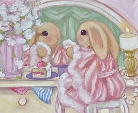 Another painting portrays a rabbit with lop ears sitting in front of a makeup vanity desk. It wears a fluffy pink robe while applying powder to its adorable face. The rabbit gazes blankly into the mirror as if drowned in troubling thoughts. Rabbits are yet another animal which have historically been subjected to animal testing for makeup and other toiletries. However, PETA (People for the Ethical Treatment of Animals) recognizes that there have been waves of change on the horizon, as in 2022, rabbit-safe regulations helped spare 27,000 rabbits in Taiwan from being tested to develop the swine fever vaccine. This is but a step in the right direction when considering the total of an estimated 400,000 rabbits that are used for product testing each year globally.