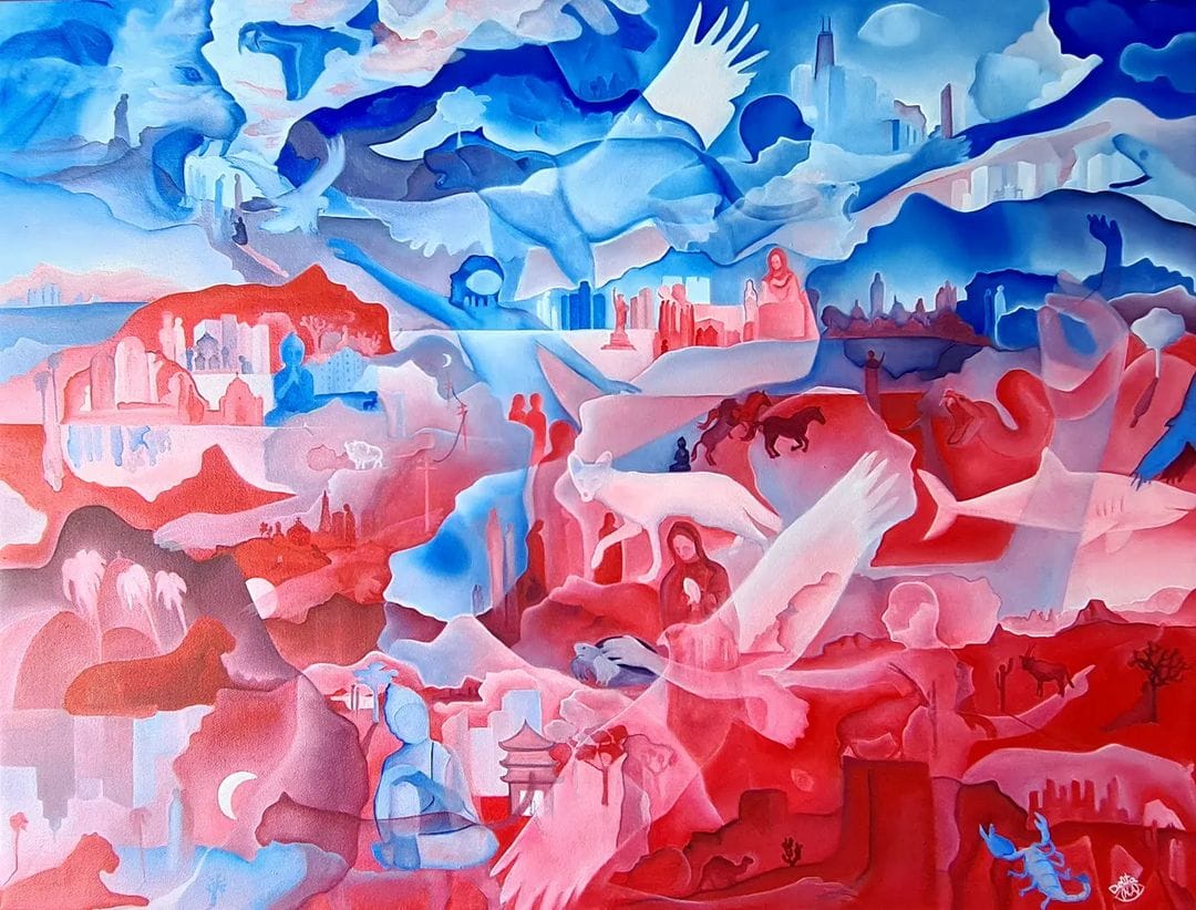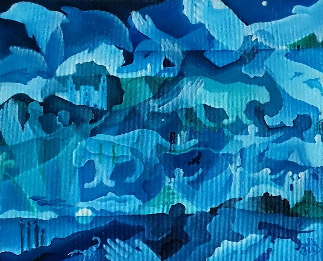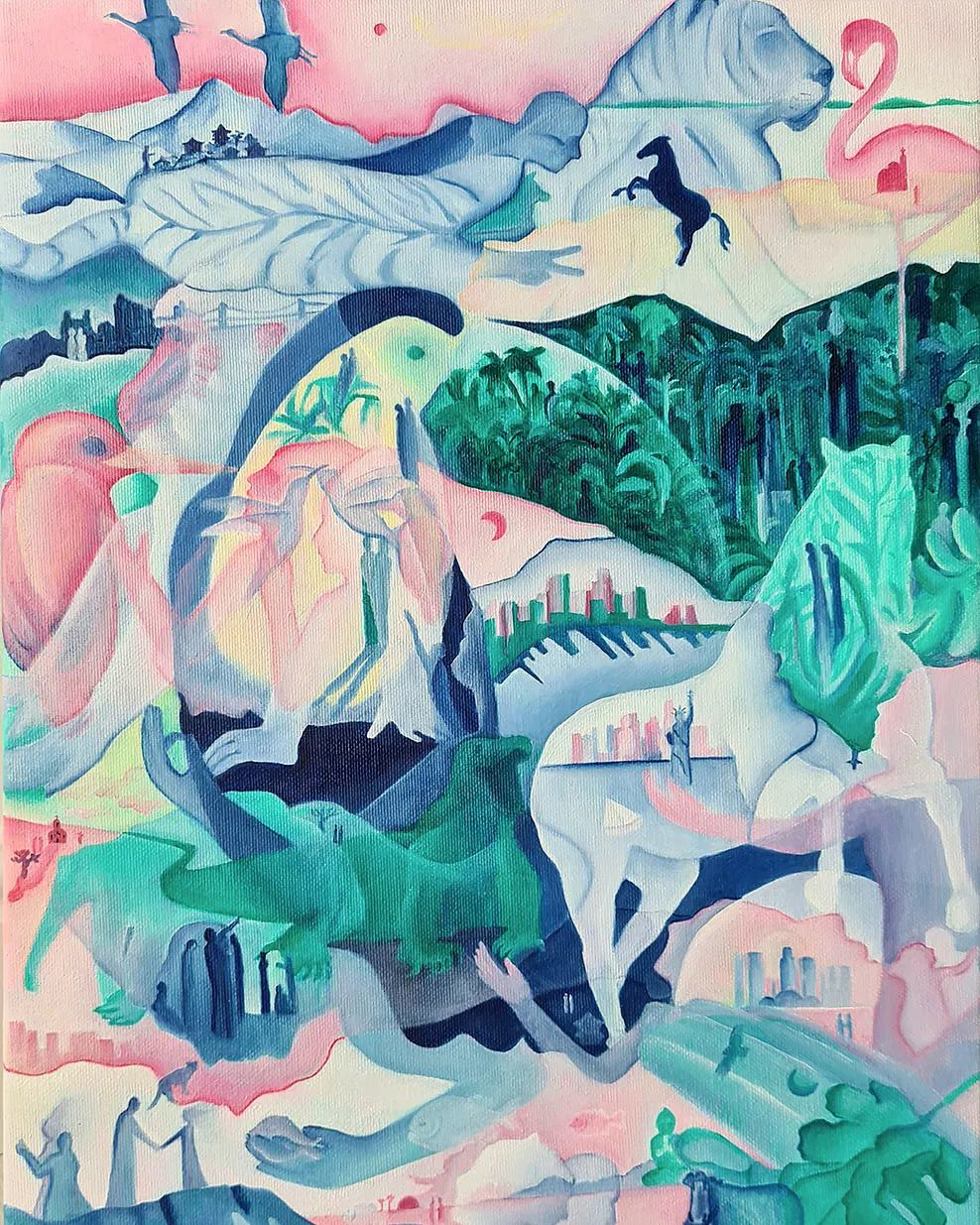 To do this, their pieces depict scenes of everyday human life—such as swimming in the ocean or walking through a cityscape—being fused with scenes of wildlife. It becomes unclear if a horse is galloping in the city or if the city is moving through the horse. These dream-like paintings appear balanced, showcasing a harmonious coexistence between human life and wildlife that is not often seen. By depicting this balance, Delta N.A. inspires and calls for its viewers to create a similarly balanced world. This is why paintings by Delta N.A. align with the United Nations Sustainable Development Goals of Life on Land and Life Below Water.