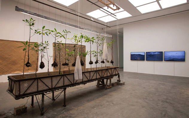 In Atienza’s exhibition Equation of State, she used suspended mangroves and her documented videos of the ocean to demonstrate how climate change has affected coastal areas, specifically in her hometown on the Bantayan Islands.