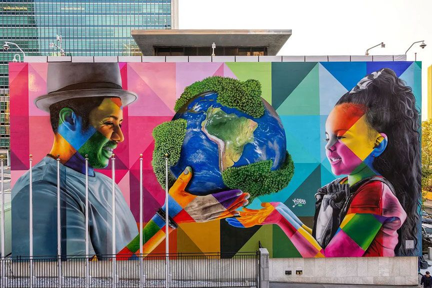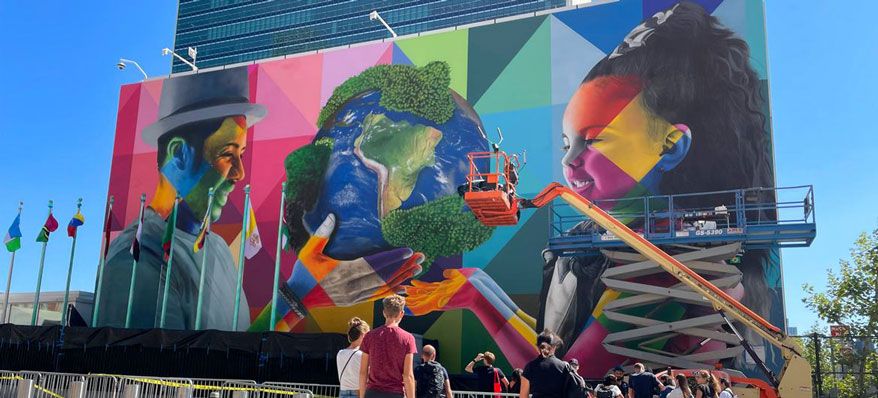 Next week marks the gathering of world leaders at the High Level General Assembly Meeting. For this event, Eduardo Kobra, a renowned artist from Brazil, created a stunning mural. Kobra is a renowned street artist who uses bright colours and strong lines in his work, a kaleidoscope of shapes and triangles.