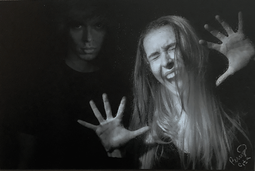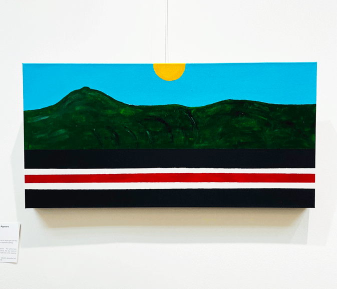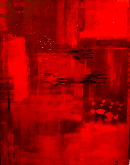 But, I Love You, a vivid red painting by Julie Lindsey explores the complicated relationship between victim and abuser. The title refers to how an abuser will tell a victim “But, I love you” to manipulate them into staying. The varying shades of red and grasping hands evoke the intensity, isolation, and loneliness of domestic violence and a sense of impending doom.