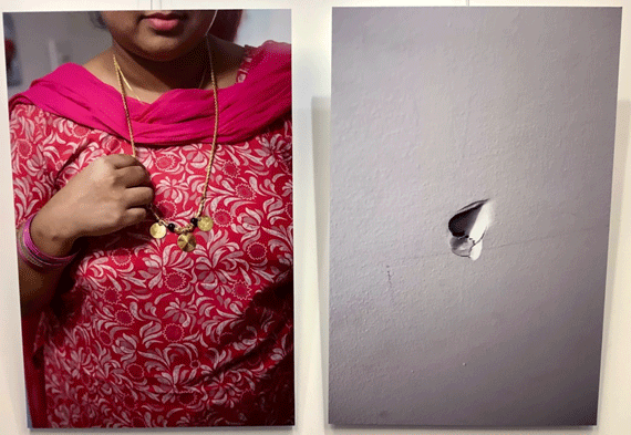 Similar in subject to Anglim’s End Child Marriage, Priyanka Sah’s photographic diptych Existence draws attention to the plight of immigrants who come to the United States in hopes of a better life, education, and job opportunities and the challenges they experience. Thousands of South Asian women are among those who come to the U.S. annually on dependents visas. Often domestically abused, they face culture shock, depression, social isolation, psychological distress and despair. The artwork addresses what the “existence” of these women might really be.