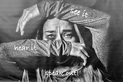 Help Me!!!!!!, a black and white photograph by Debra Perrigo-Trombly whose photograph, See it, Hear it, Speak Out! gives the exhibition its name and graces the cover of the program, dramatically represents the feelings of panic and fear victims of domestic violence experience. The ominous presence of the abuser in the shadows of Help Me!!!!! stares directly at the viewer.