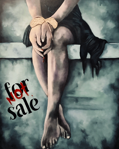 On the opposite wall, another work entitled Not For Sale is a mixed media painting by Susan Saab Hagan representing the bound hands and body of a teenage girl sold into slavery. Still another painting by Haggen, Nocturnal One, depicts a defiant-looking prostitute sitting on a curb, alludes to the fact that most sexual abuse and maltreatment of women occurs at night.