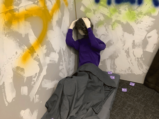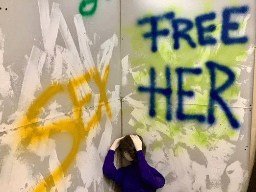 Free Her, an interactive mixed media installation Anglim built in collaboration with Chicago artist, carpenter, and metalworker Summit Ellens, simulates the experience of walking into a hut where human trafficking victims are kept. Inside, a female mannequin on a mattress cowers in fear with her hands covering her face protectively. Brightly spray-painted above and around her are many words including “free her,” “sex,” “domestic servitude,” “debt bondage” and “forced marriage.”