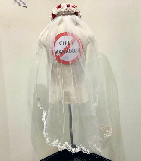 End Child Marriage, a mixed-media work about the impact of child marriage on the physical and mental health of girls, features the torso of a mannequin draped with an embroidered wedding veil and crown of artificial flowers, as a no smoking-like sign adhered to its chest proclaims “no child marriage.” As Anglim’s work reminds us, child marriage is not just confined to third-world countries. The youngest girl known to become a bride in Michigan was just eight years old. Even today, marriage at as young as fourteen is allowed with judicial consent in the state.