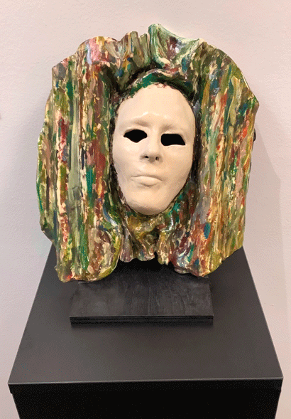 Like Anglim’s painting All Is Not As It Appears, Silence, a porcelain mask by Shauna Bradshaw is a meditation on the pain she felt in the aftermath of sexual assault by a stranger. As Bradshaw states, “The face represents innocence and the purity of our beliefs as we [women] mature into adulthood [w]hile the closed mouth reminds us of how hard it is to find our voice when that innocence is taken.”