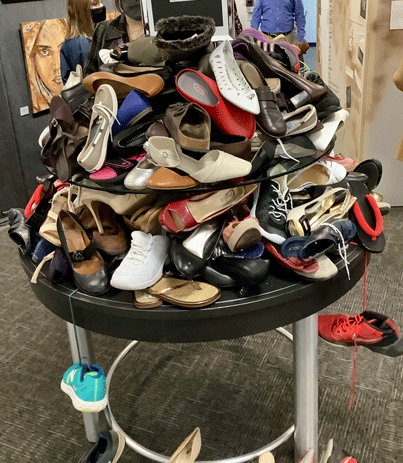 Anglim’s How Many More? an installation consisting of a pile of shoes donated by women in the Fenton community and survivors of intimate partner and domestic violence, represents the lives of women impacted by domestic violence daily in Michigan.