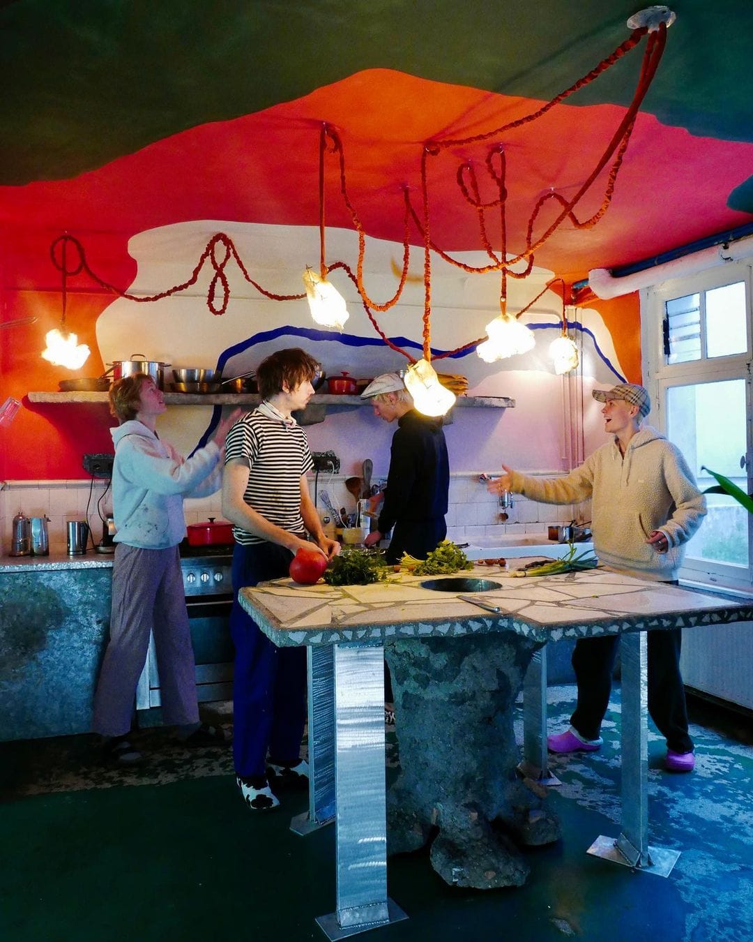 Espace Aygo, a collective of young artists and designers in Brussels has renovated a derelict 19th-century townhouse into their home, studio and experimental art space. These renovations were carried out sustainably using salvaged materials and handmade upcycled furniture. The collective had to think creatively about how different salvaged items can be repurposed as household items, such as fashioning cups and beer glasses into a chandelier.