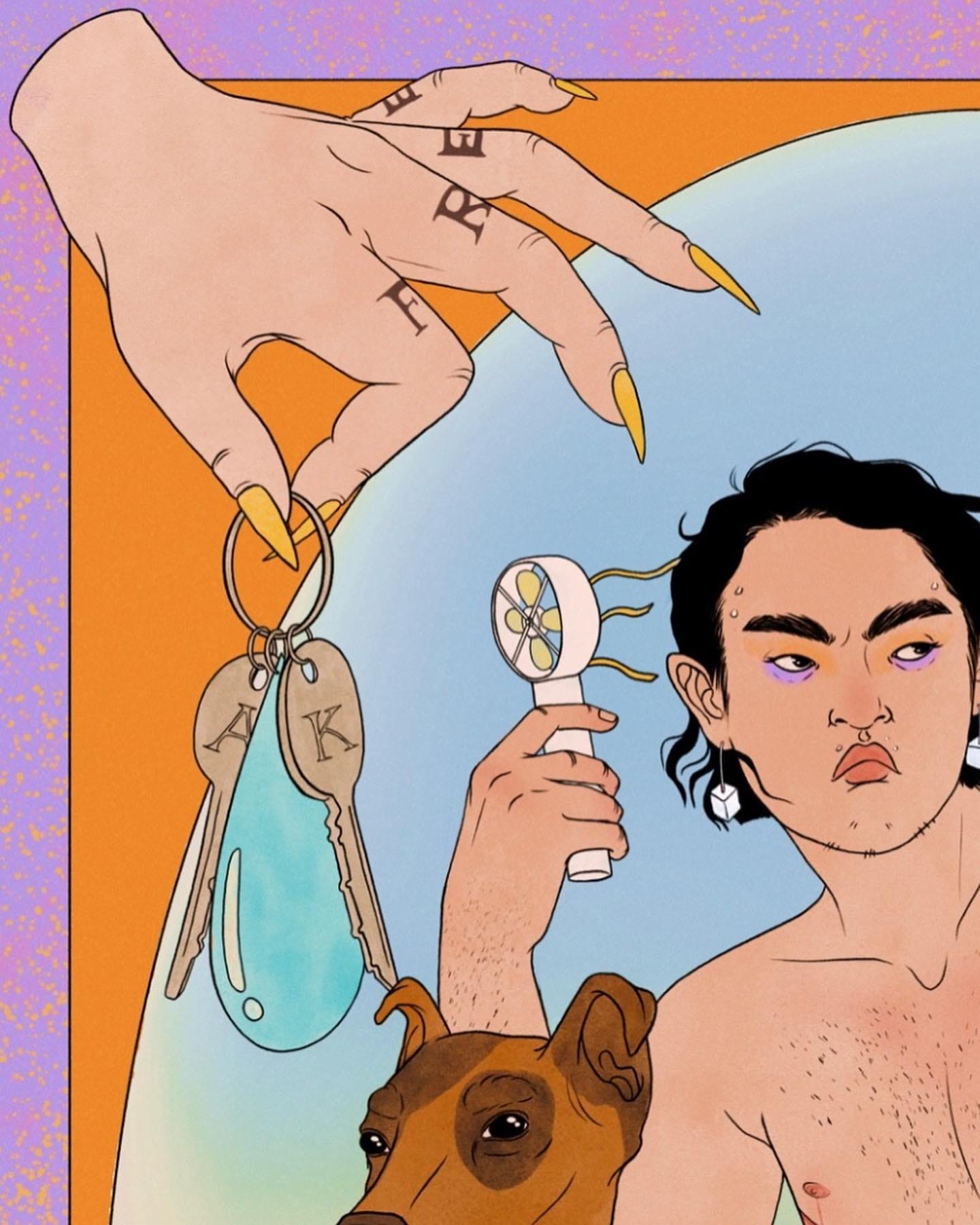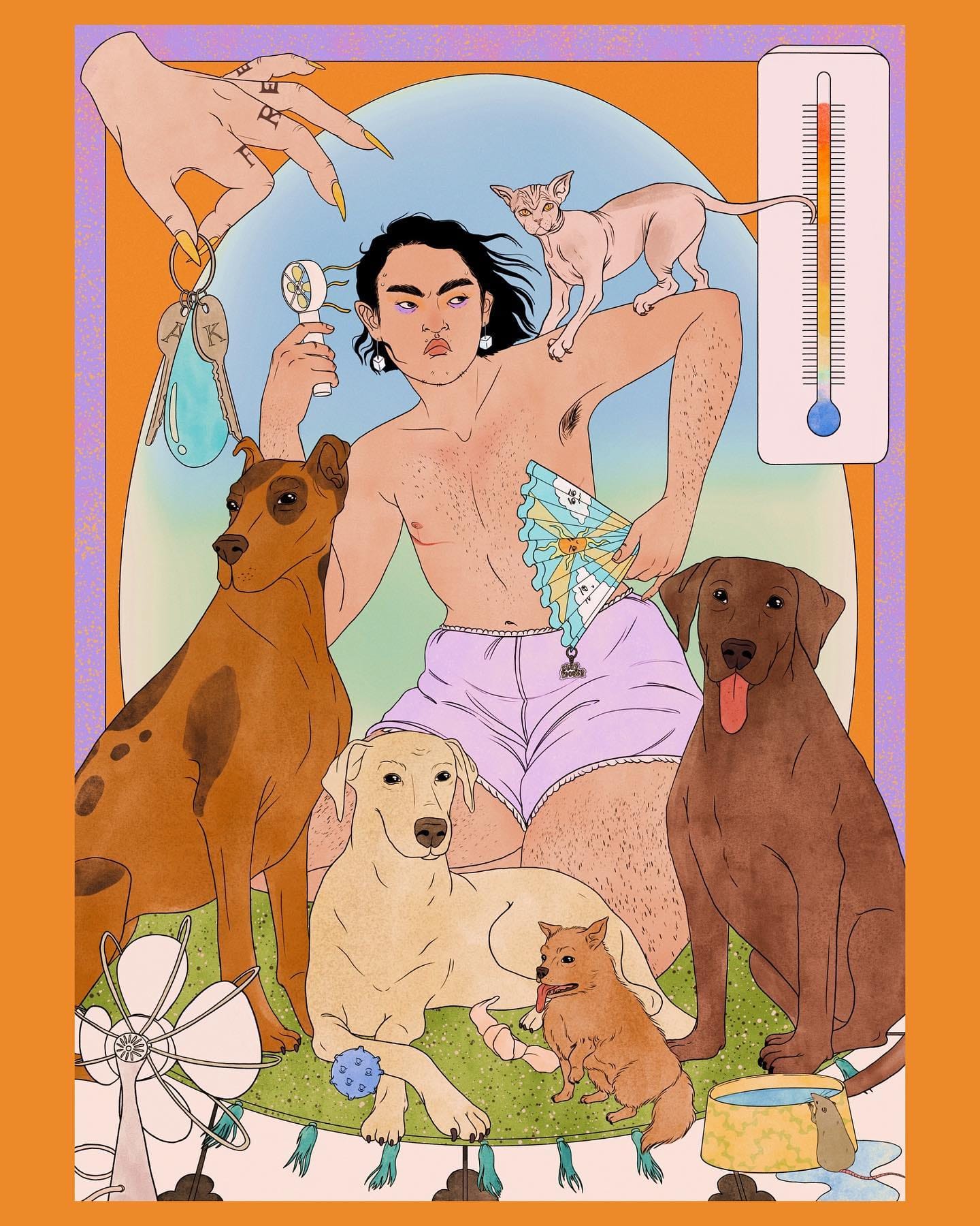 In their piece for the campaign, Khullar has depicted a non-binary person at home, surrounded by their pets. They associate their freedom to be and exist with the ability to stay home and be alone with their pets. However, the depicted non-binary figure has their shirt off, visibly battling the heat as they hold a fan to their face. This manifests Khullar’s worries, where they contemplate how climate change and rising temperatures impede everyone’s freedom to exist. The piece becomes a reminder of an intersectional approach to climate change. These workable solutions include everyone without exception, including queer people, as it indeed affects everyone on the planet with no exception. This is why the piece is aligned with the United Nations Sustainable Development Goals of Gender Equality and Climate Action.