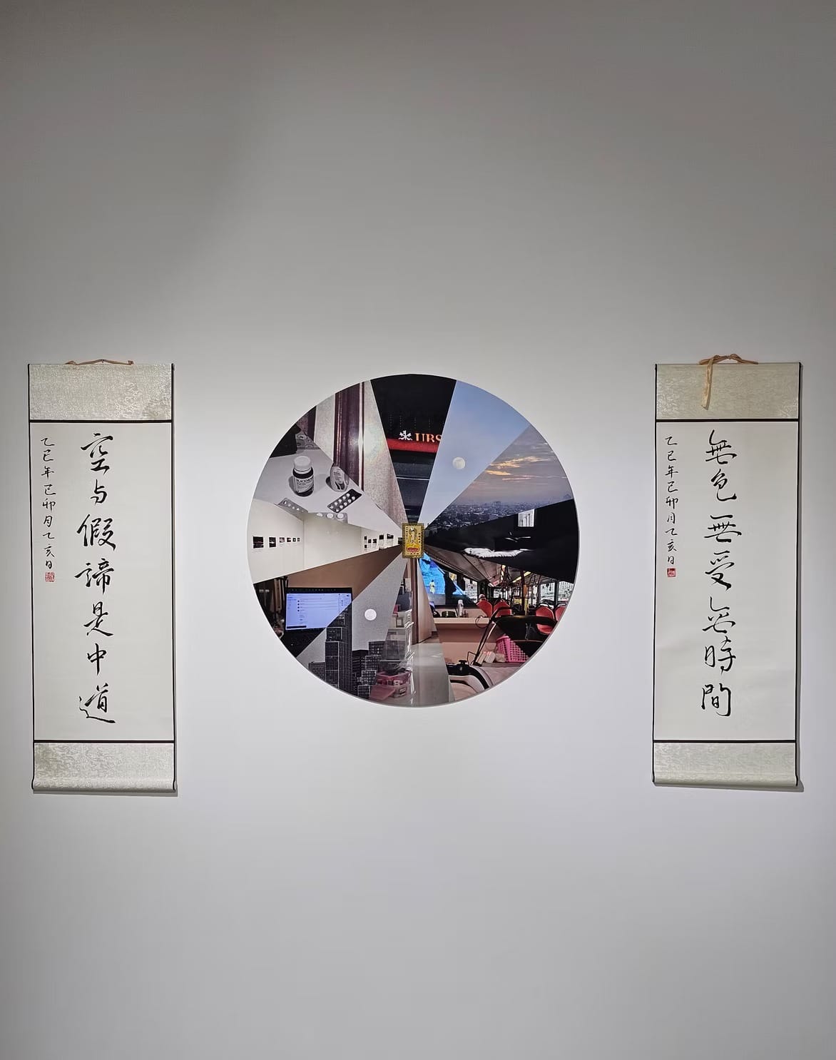 The two scrolls are inscribed with “There is no form, no feeling, no time” and “The Truths of Emptiness together with Conditional Phenomena will bring the Truth of The Middle Path”. These scrolls act as answers to the problem presented by the visual clock. They are meant to be a sort of nianfo, or Buddhist chanting rituals, that will aid a person’s meditation when trying to release themselves from capitalist chrononormativity. These words frame the hours of a day as "time to simply be" rather than to work, offering everyday labourers an emancipatory reimagining of temporality rooted in the Buddhist concept of śūnyatā (emptiness).