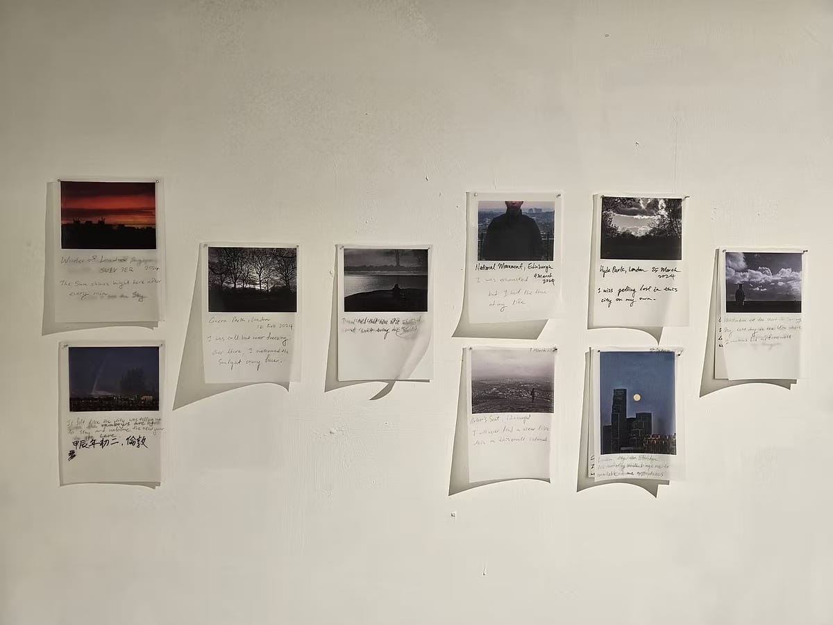 In I Need More Time (marker and photo prints on tracing paper), Ho maps the displacement he felt after returning to Singapore from London, where he had spent time studying and briefly experienced queer belonging. In the piece, Ho leaves honest hand-written notes on photographs he has taken between Singapore and London, outlining the different emotions he feels in these spaces. The results explicitly critique Singapore’s strict adherence to societal timelines— highlighting pressures to get steady jobs and fall into heterosexual marriage—that ultimately renders queer existence "untimely." It is this personal alienation that becomes a lens to expose how capitalist time demands suffocating conformity.