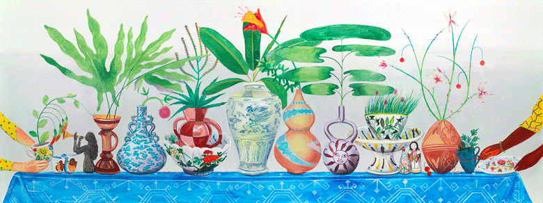 "We also wanted to incorporate the locals through the idea of the table. We’re always talking about “making room at the table” and this mural represents that idea. There are aspirational things that look at the highest achievements of our culture to homey, small, everyday things that are for everybody. It includes cultures from around the world and all the people who live in the city. It also includes a nod to local artists. I did all the vessels. Rajni is a freestyle genius who did all the greenery, plants and lines.”