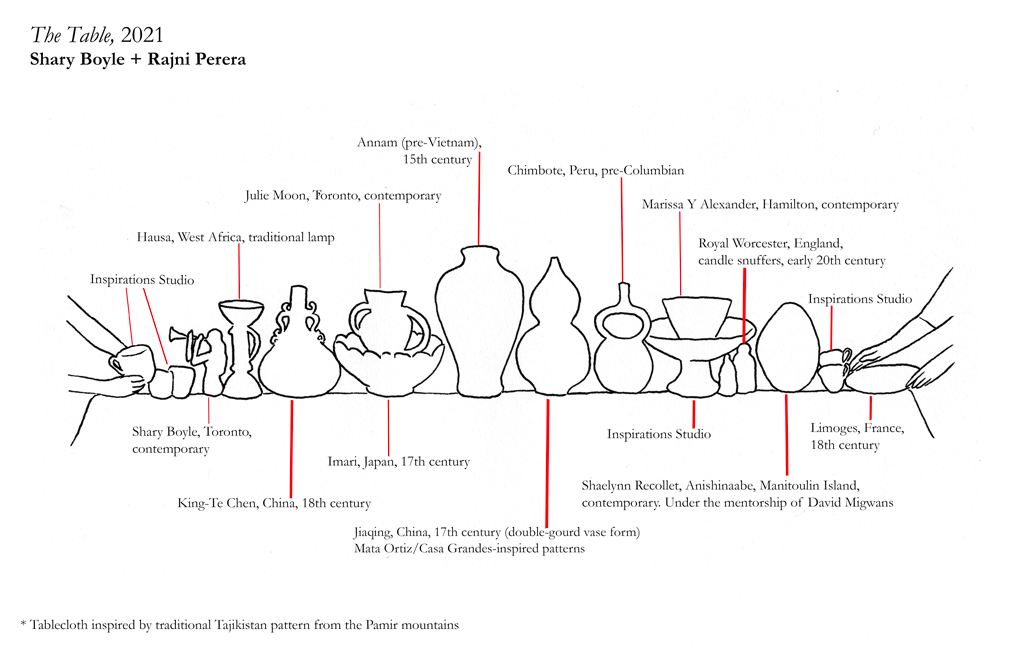 "So often in the public art sphere, you’ll see work at new condos and financial districts that are loopholes for tax breaks. What aren’t we making beautiful art for people who are going to be sitting in here every day themselves making new art for the community? People walking by will stop in front of the studio and look through the windows. I asked Rajni if she wanted to collaborate and she said sure. It’s a table with world ceramics. Clay is one of the first classic materials people all over the world have used and we all have cultural ancestry with clay. It’s bonding and inclusive," explains Boyle.