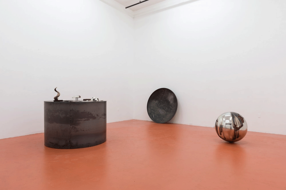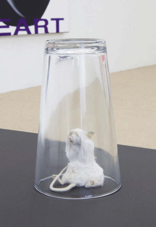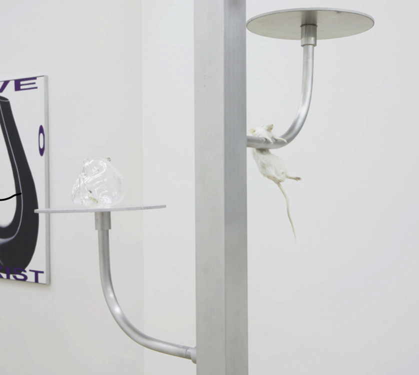 In 2016, The Crucible’s Nest exhibition featured a coffee table with an intricate decanter and taxidermied rat trapped in a clear glass. The aluminum sculpture houses another glass sculpture with hanging taxidermied rats. The perpendicular wall contains a set of paintings that references the decanter with various quotes to denote the theme of the exhibition. Lastly, a reclining chair with aluminum poking it sits on the corner of the room.