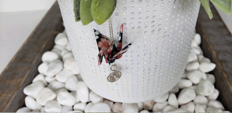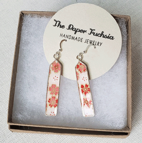 My parents used to sell beads when I was growing up. They would sell them at the flea market and I would just take those beads and make jewelry out of them and sell them. That was my first foray into making jewelry. I didn’t really rediscover it until I was in my twenties. I didn’t plan on becoming a jewelry maker. It was the summer and I was thinking “Oh, how can I make some money?” I love origami, so I was trying to make stuff out of origami and sell it. I threw together some little origami earrings and people were buying them! I was like “Okay, I’ll just make more of those!” I discovered this paper, it’s this Japanese paper called yuzen paper. It has these really beautiful prints. I was like “How can I represent this in a way that really shows its true beauty?” So I would do different things, I would take a piece of paper and stick it on a wire, [make it] a little shape that looks like a fan or something.