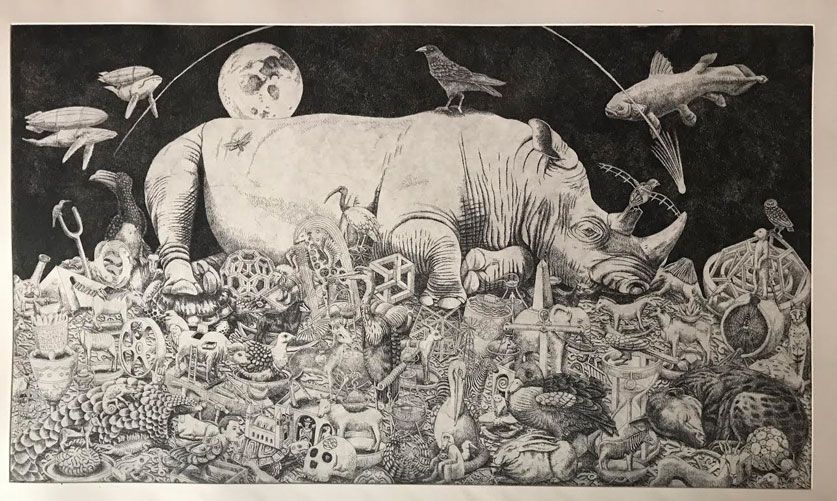 He imagines conversations with the endangered animals he depicts, making his works conceptual and intriguing. The works are beautifully detailed and creative—each animal has its own personality brought to life with careful consideration.