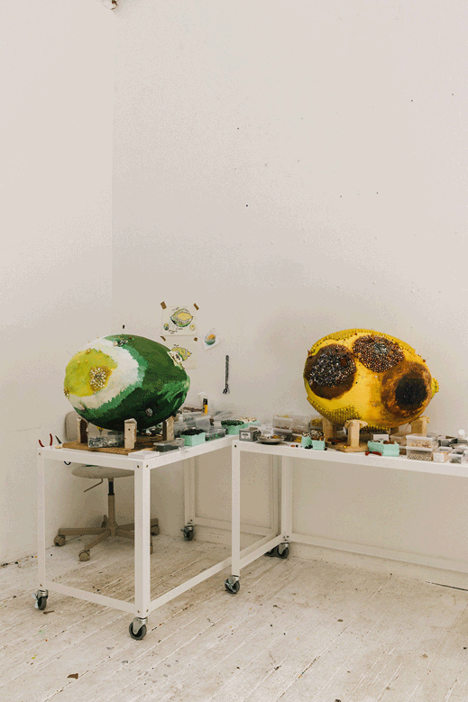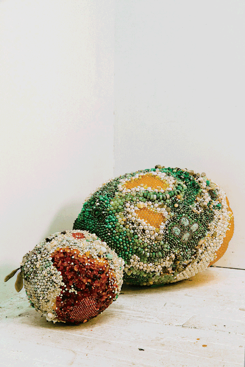 Kathleen Ryan is currently based in New York City, and focuses entirely on meticulous sculptures. Her current work is primarily focused around creating large sculptures that look like rotting fruit. The pieces are made from polystyrene foam, cut to the fruit shape, and then decorated with individual gemstones held up by stainless steel pins to bring the rotten fruit to life. On average, a 30 inch wide lemon can take up to two months to properly decorate and finish with around 10,000 beads.