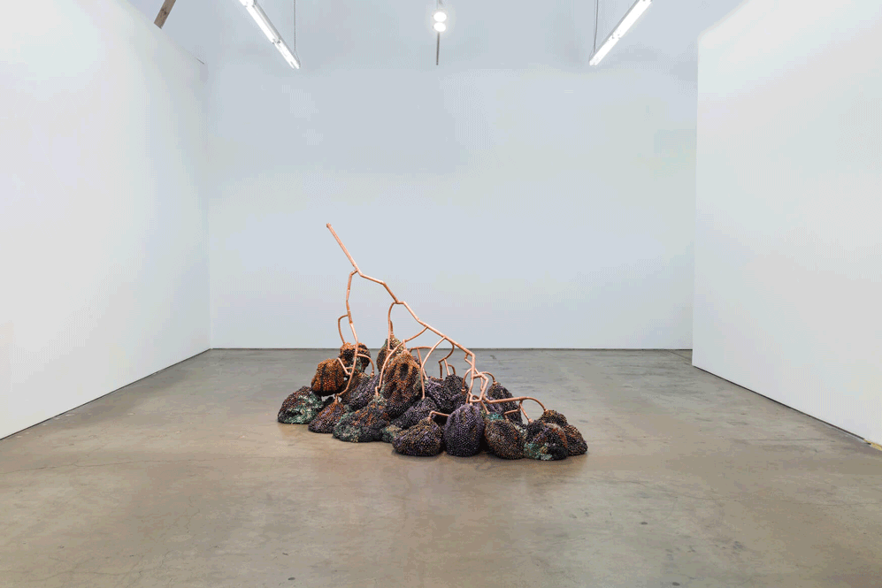 Bad Grapes (2020) is one of the Kathleen Ryan sculptures that was exhibited at the Francois Ghabaly gallery from February to March 2020. The massive sculpture measures at 151 x 228.5 x 137 cm or 59.5 x 90 x 54 inches and is composed of 25 types of semi-precious gemstones and 6 multimedia elements.