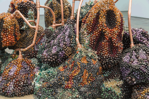 Kathleen Ryan’s technique may remind some of a classic craft called sequining. This craft is typically used to make homemade ornaments or unique animal sculptures. A sequin is placed on a small pin with a tiny head; the pin is then inserted in the styrofoam shape. Designs like stripes and swirls are common on the spheres, but many opt for a simple splash of color all around. Compared to this craft, one will really understand how long and intricate Ryan’s process for these ambitious sculptures is.